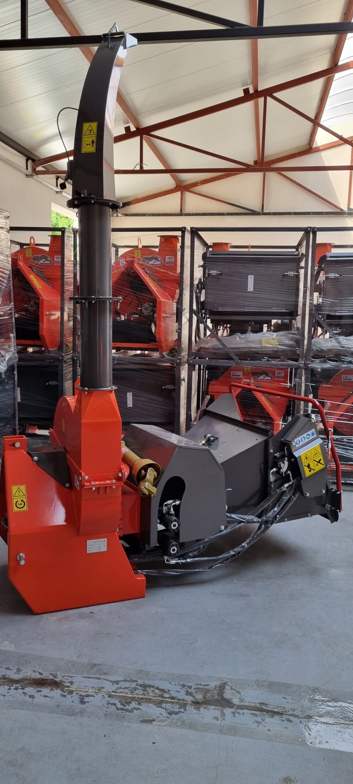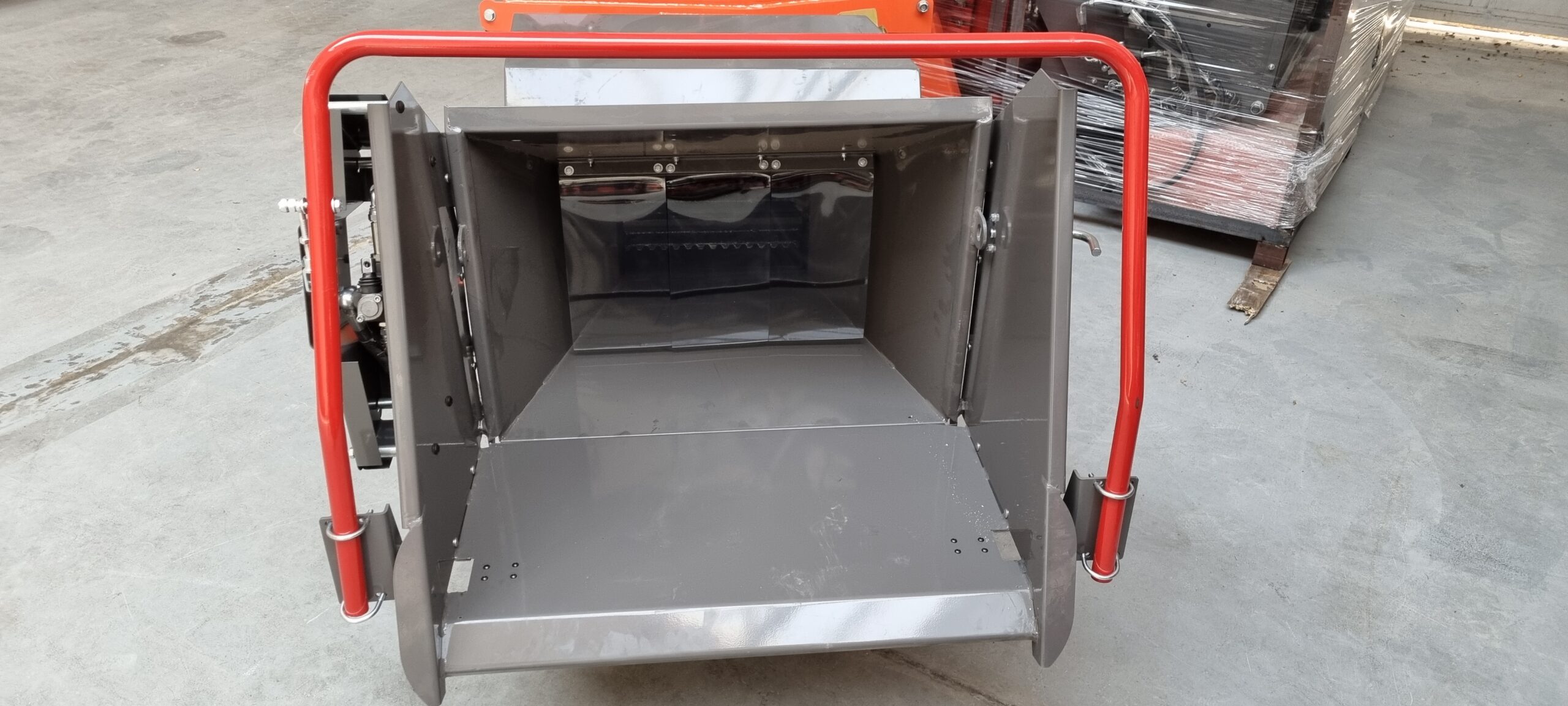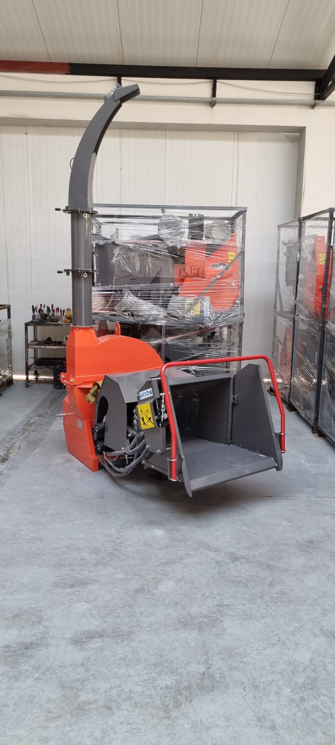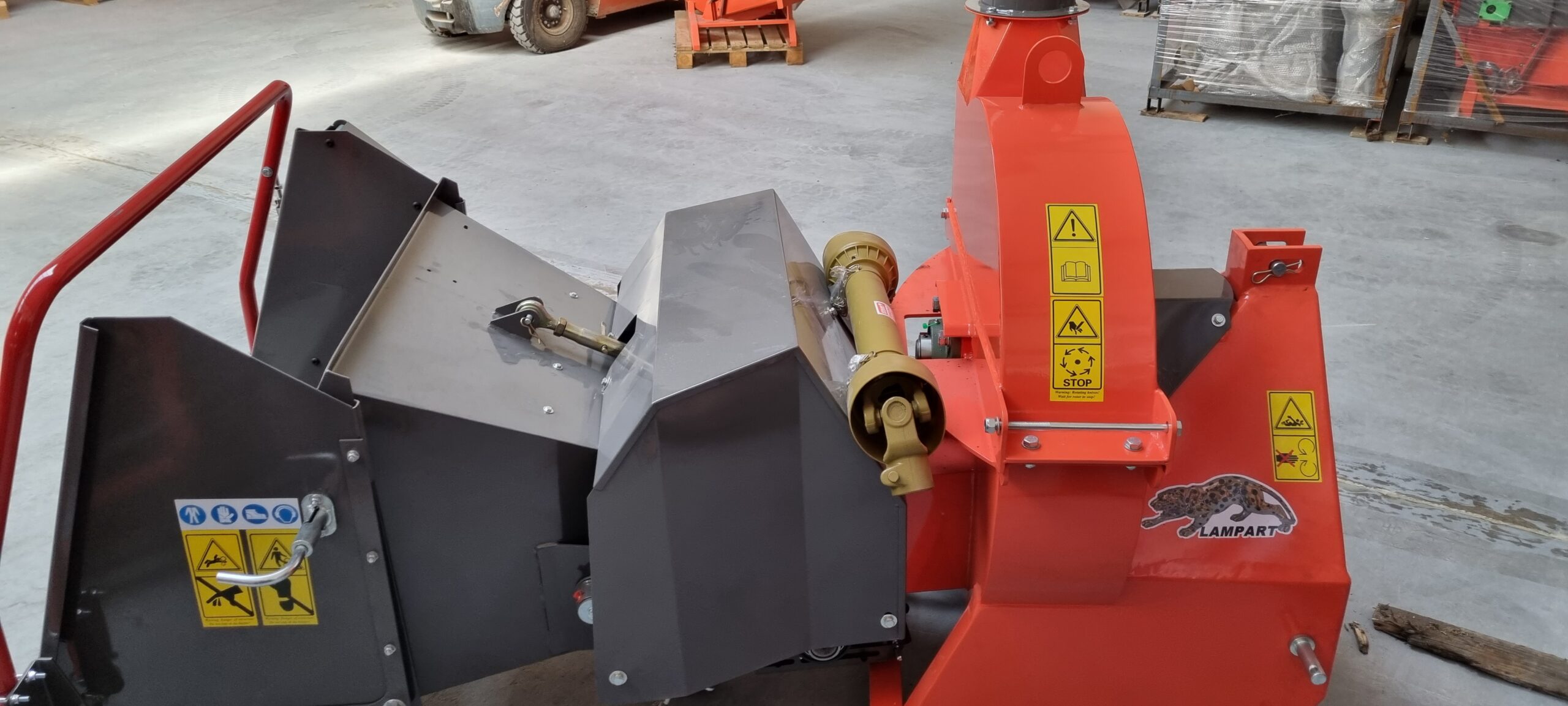 Poniżej zdjęcie rębaka w pozycji transportowej – dzięki składanemu lejowi, możliwa jest szybka i łatwa zmiana gabarytów, co zaoszczędzi miejsce podczas transportu.